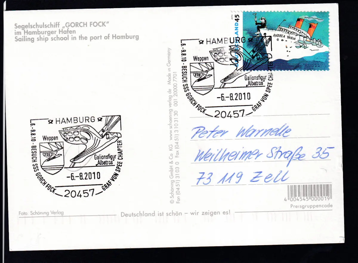 HAMBURG 20457 6.-9.8.10 BESUCH SSS GORCH FOCK GRAFVON SPEE CHAPTER Wappen Galionsfigur "Albatros" 6.8.2010 auf CAK (SSSGorch Fock)