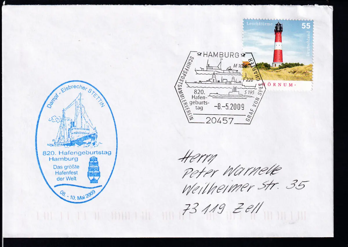 HAMBURG 20457 SCHIFFSPOSTSAMMLERVEREIN GRAF VON SPEE CHAPTER 820. Hafen-geburts-tag 8.5.2009 + Cacher auf Brief