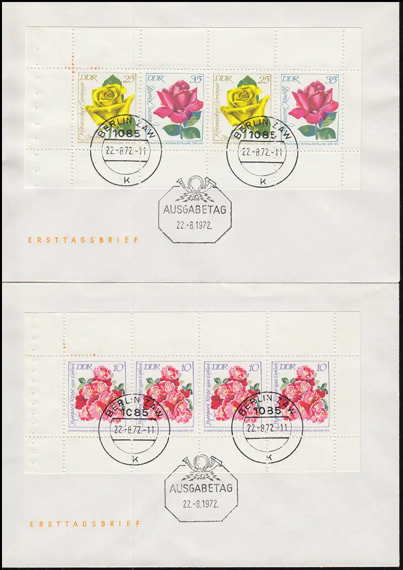 HBl. 14A und HBl. 15A Rosenausstellung-Heftchenblätter auf Blanco-FDC BERLIN ZAW