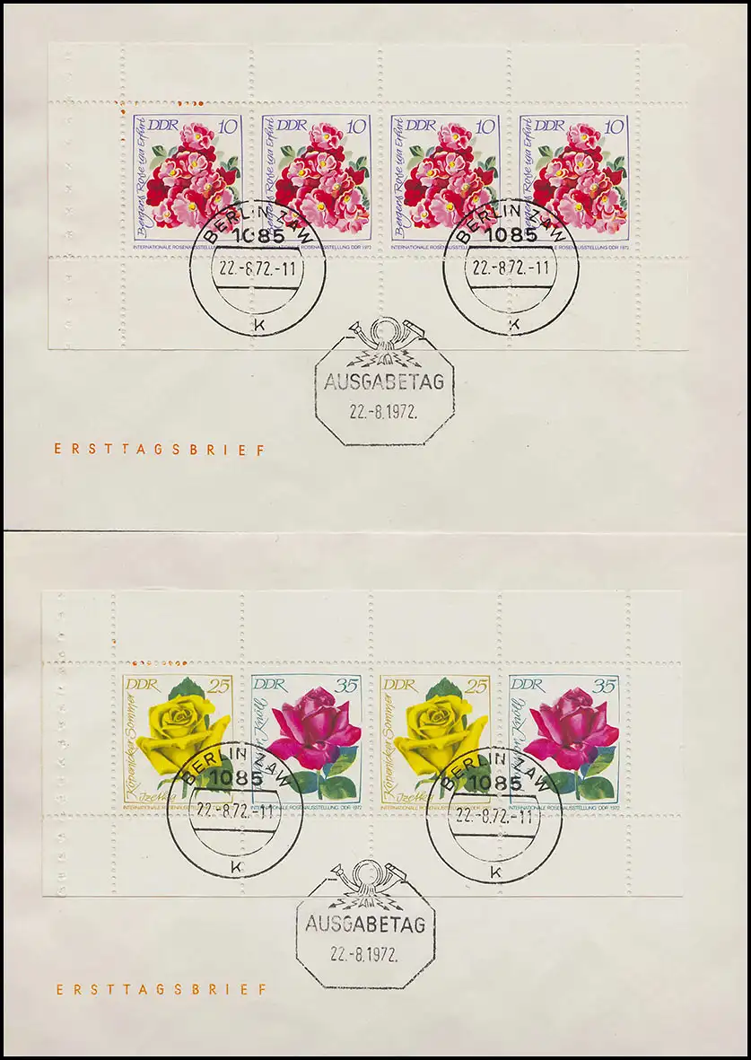 HBl. 14A und HBl. 15A Rosenausstellung-Heftchenblätter, beide auf FDC BERLIN ZAW