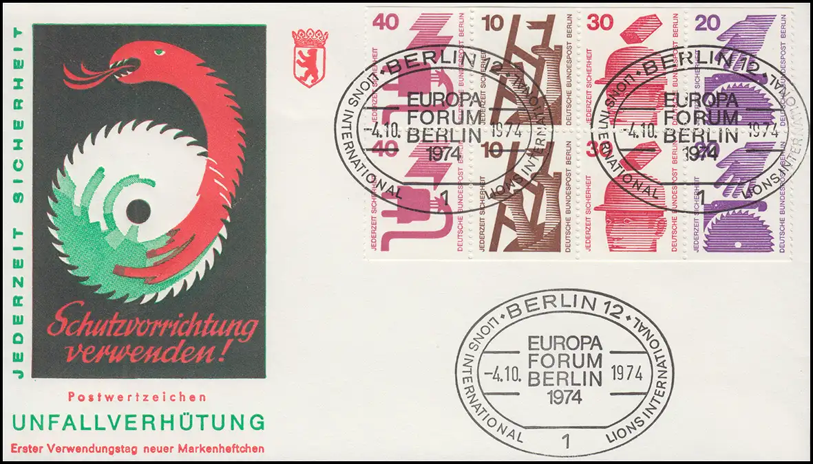 HBl. 17 aus MH 9 Unfall auf Schmuck-FDC ESSt BERLIN Europa-Forum 4.10.74