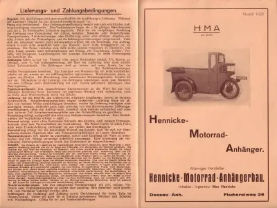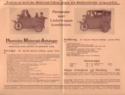 4 Seiten DinA5 Das Fahrzeug wurde als Hennicke Motorrad Anhänger bezeichnet, dabei handelt es sich jedoch um ein motorbetriebenes Dreirad, vorn mit einem Rad. Es war für 3 Personen konstruiert worden. Das Fahrzeug gab es offen oder geschlossen. Guter Zustand