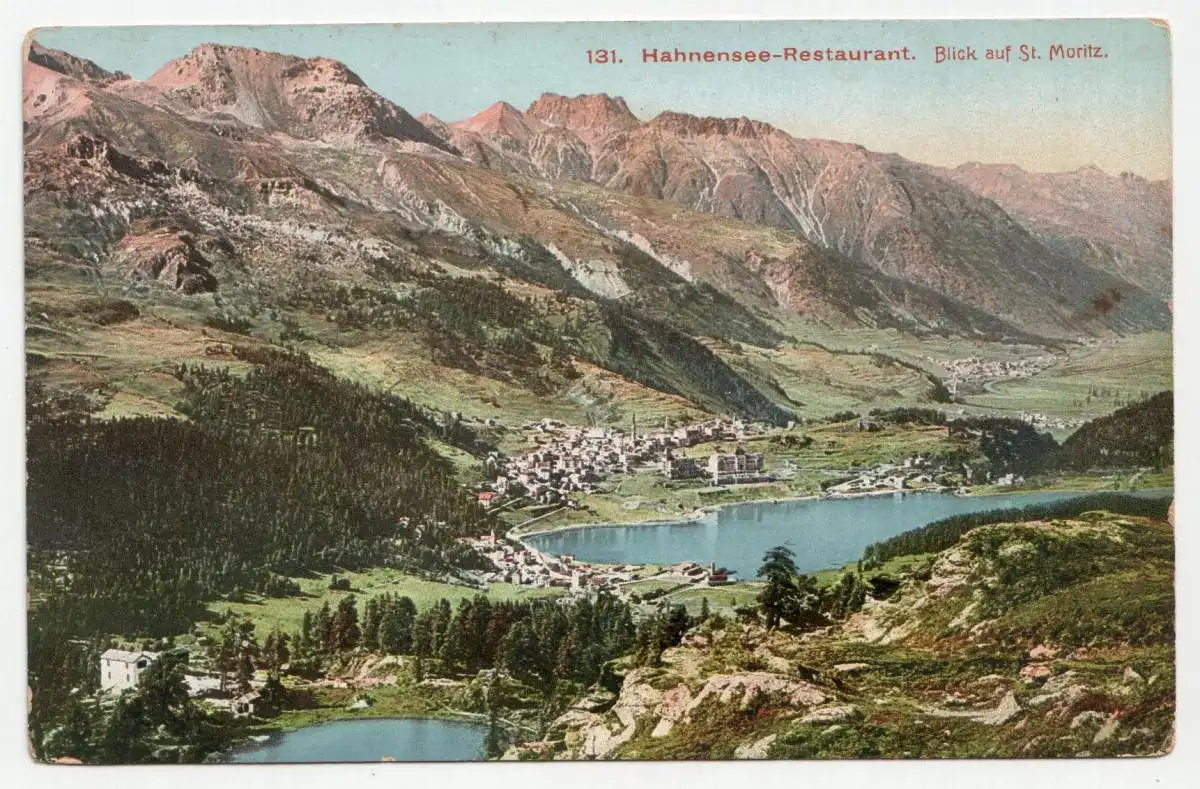 Hahnensee-Restaurant. Blick auf St. Moritz.
