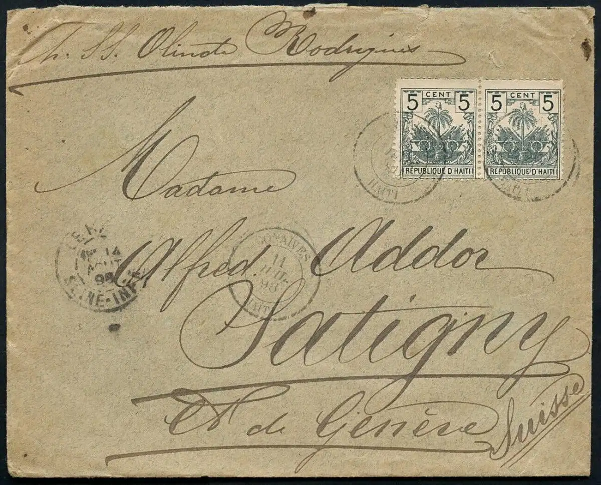 Brief aus Gonaives mit Paar 5 Cent Wappen via SS Olinda über Le Havre in die Schweiz gelaufen.