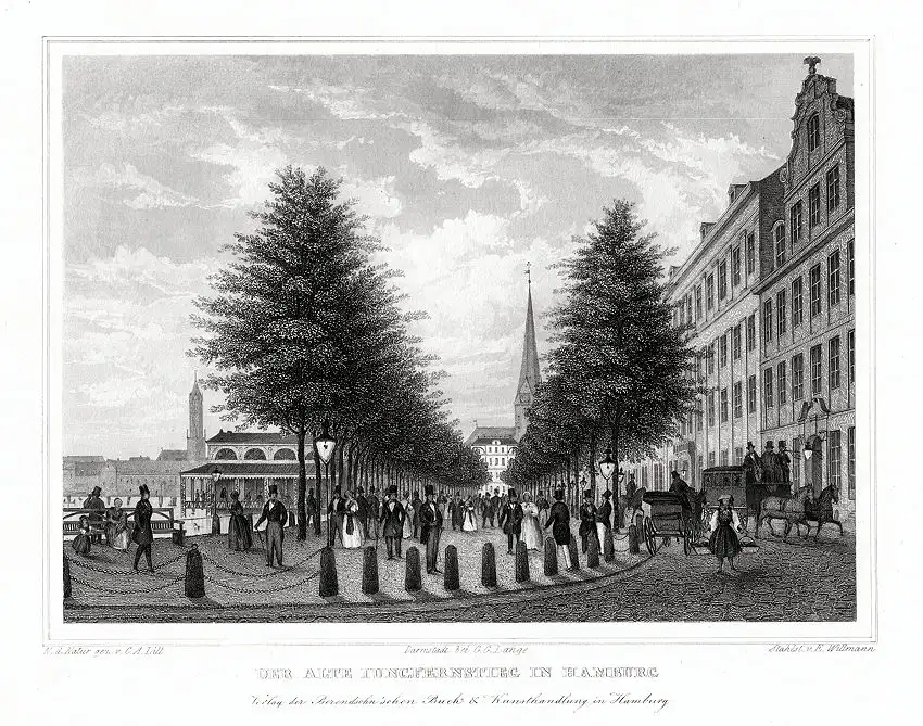 Hamburg - Der alte Jungfernstieg. Originaler Stahlstich von Willmann um 1850