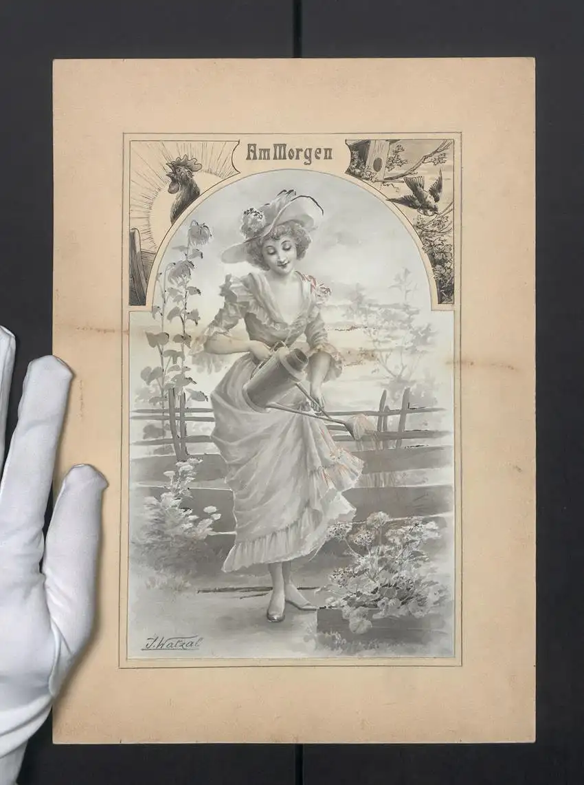 Handzeichnung / Ansichtskarten-Entwurf Johannes Watzal, hübsche junge Dame giesst Blumen am Morgen im Garten