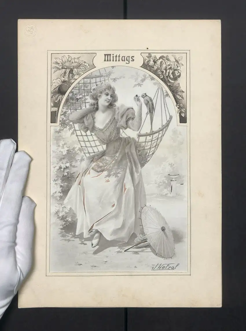 Handzeichnung / Ansichtskarten-Entwurf Johannes Watzal, hübsche junge Dame in Hängematte sitzend füttert Vogel