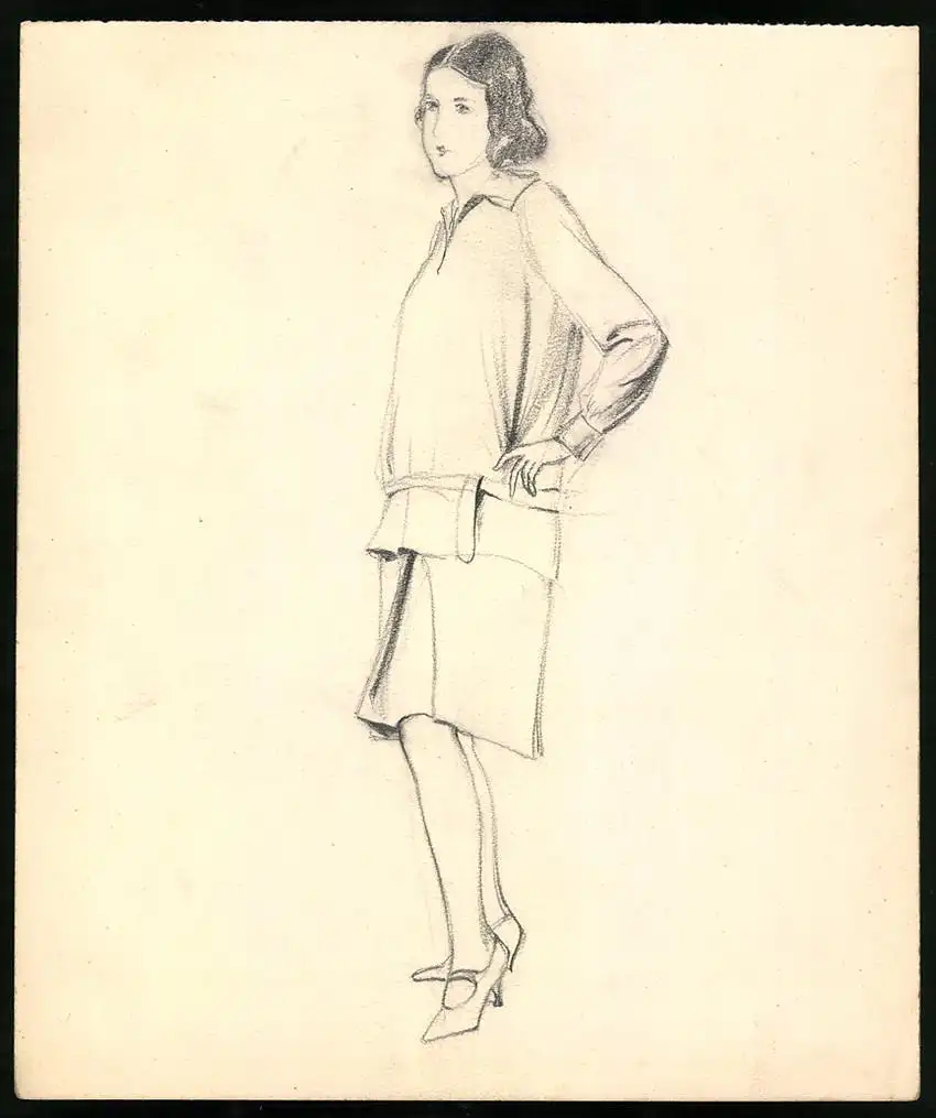 Handzeichnung Bleistiftzeichnung Mode, Frau im rock mit Bluse und Hochhackigen Schuhen, 21 x 25cm