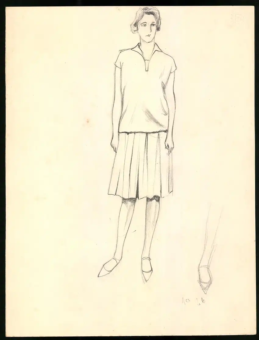 Handzeichnung Bleistiftzeichnung Mode, junge Frau im Faltenrock mit Bluse, auf auf Spitta & Leutz Berlin Karton