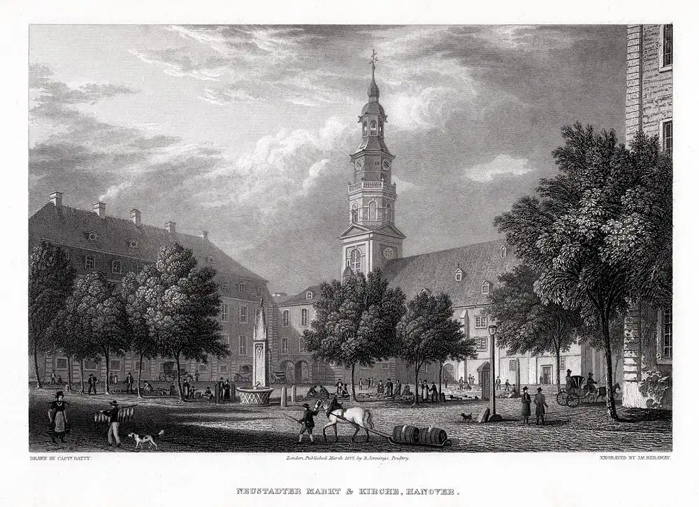 Hannover- Neustädter Markt und Kirche - Orig. Stahlstich v. Redaway / Capt. Batty von 1829