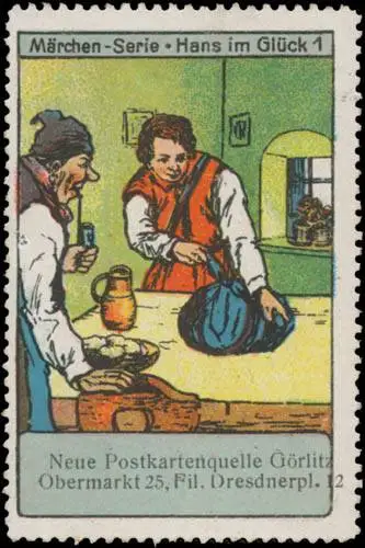 Märchen-Serie. Neue Postkartenquelle in Görlitz, Bruno Hanzig, Ansichtskarten und Schreibwaren, Obermarkt 25, Filiale: Dresdner Platz 12, Größe/Zustand: 6x4 , guter Zustand, Original alte Reklamemarke die seinerzeit für die Werbung benutzt wurde