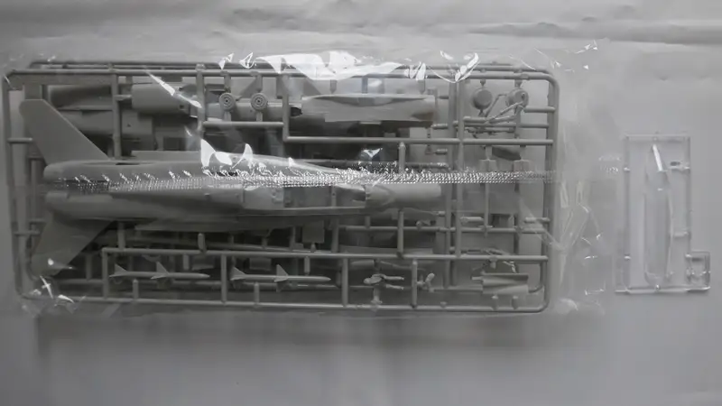 Einzelteile (Plastikbauteile) sind noch am Rahmen fixiert, Sichthülle wurde geöffnet.