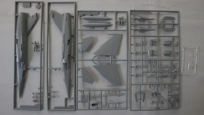 Einzelteile (Plastikbauteile) sind noch am Rahmen fixiert; Sichthülle wurde geöffnet.