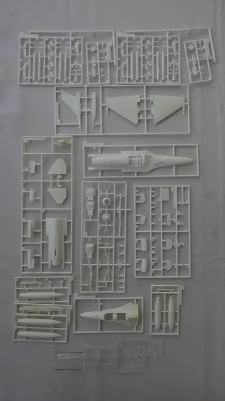 Einzelteile (Plastikbauteile) sind noch am Rahmen fixiert, Sichthülle wurde geöffnet.