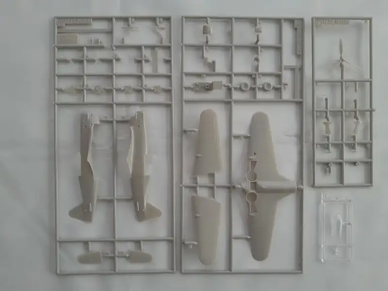 Einzelteile (Plastikbauteile) sind noch am Rahmen fixiert. Sichthülle wurde geöffnet.