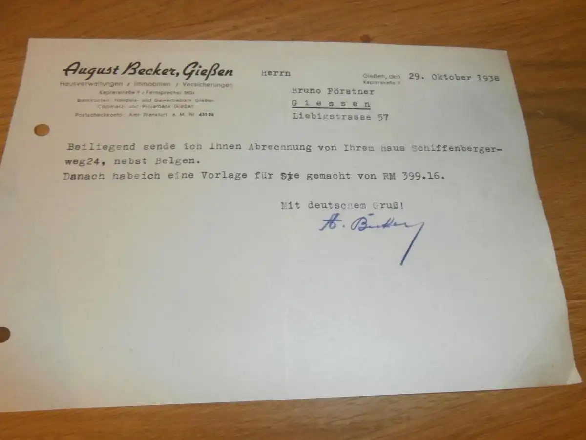 Hausverwaltungen - August Becker in Gießen , 1938 , altes Dokument / Rechnung , Reklame / Werbung , Giessen !AZ9-W
