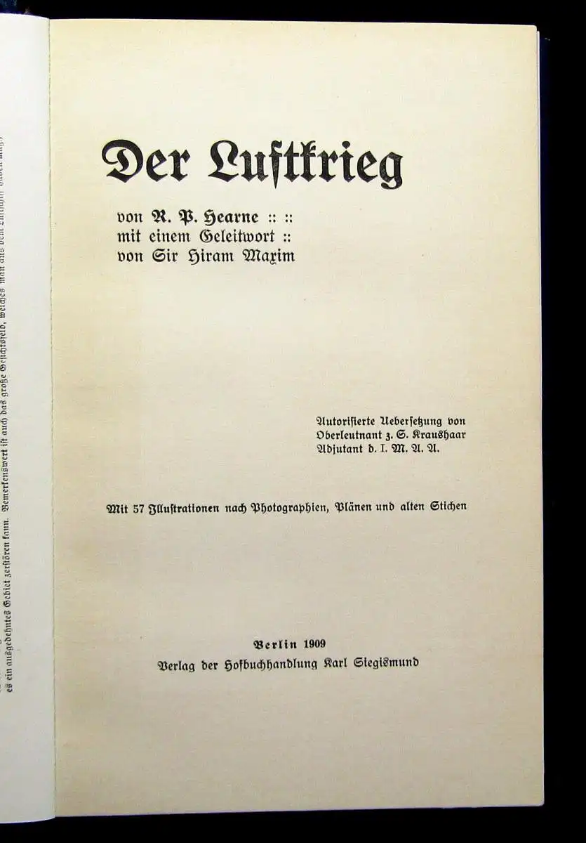 Hearne, R.Der Luftkriegmit 57 Illustrationen nach Photographien, Plänen und alten Stichen -Berlin - Siegismund -1909 Sprache: Größe: 8° (ca. 23 cm x 15 cm) Kollation/Einband: 255 S.; Leineneinband Zustand: Einband etwas berieben und bestoßen. Papier etwas gebräunt, stellenweise braun- und fingerfleckig. Mit kleinem Aufkleber auf vorderem Spiegel. Bilder sind Bestandteil der Zustandsbeschreibung. Zustand wurde bereits im Preis berücksichtigt.