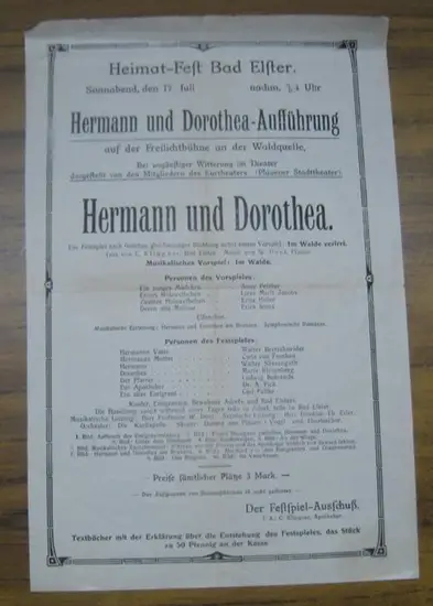 Heimatfest Bad Elster. - Freilichtbühne an der Waldquelle. - Kurtheater ( Plauener Stadttheater ): Programmzettel zu: Hermann und Dorothea. - Aufführung am Samstag, 17. Juli ( ohne Jahr ). - Musik: W(alter) Dost. - Mitwirkende: Walter Bretschneider, Carla