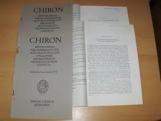 Titel: KONVOLUT VON 4 HEFTE CHIRON - MITTEILUNGEN DER KOMMISSION FÜR ALTE GESCHICHTE UND EPIGRAPHIK DES DEUTSCHEN ARCHÄOLOGISCHEN INSTITUTS : Rudolf Till "Der Befehl" aus Bd.3 1973 S.109-118 / Manfred Claus "Probleme der Lebensalterstatistiken aufgrund römischer Grabinschriften" aus Bd.3 S.395-417 inkl. Tabellen / Dieter Hennig * "Zu der alexandrinischen Märtyrerakte P. Oxy. 1089" Bd.4 1974 S.425-440 / Dieter Hennig * "Zu neuveröffentlichten Bruchstücken der `Acta Alexandrinorum" Bd.5 1975 S.318-335. + 2 AUTOGRAPHEN. Sonderdruck - Estratto - Extraits