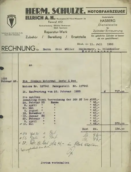 Hermann Schulze, Ellrich Rechnung Zündapp Derby L 200 von 1936