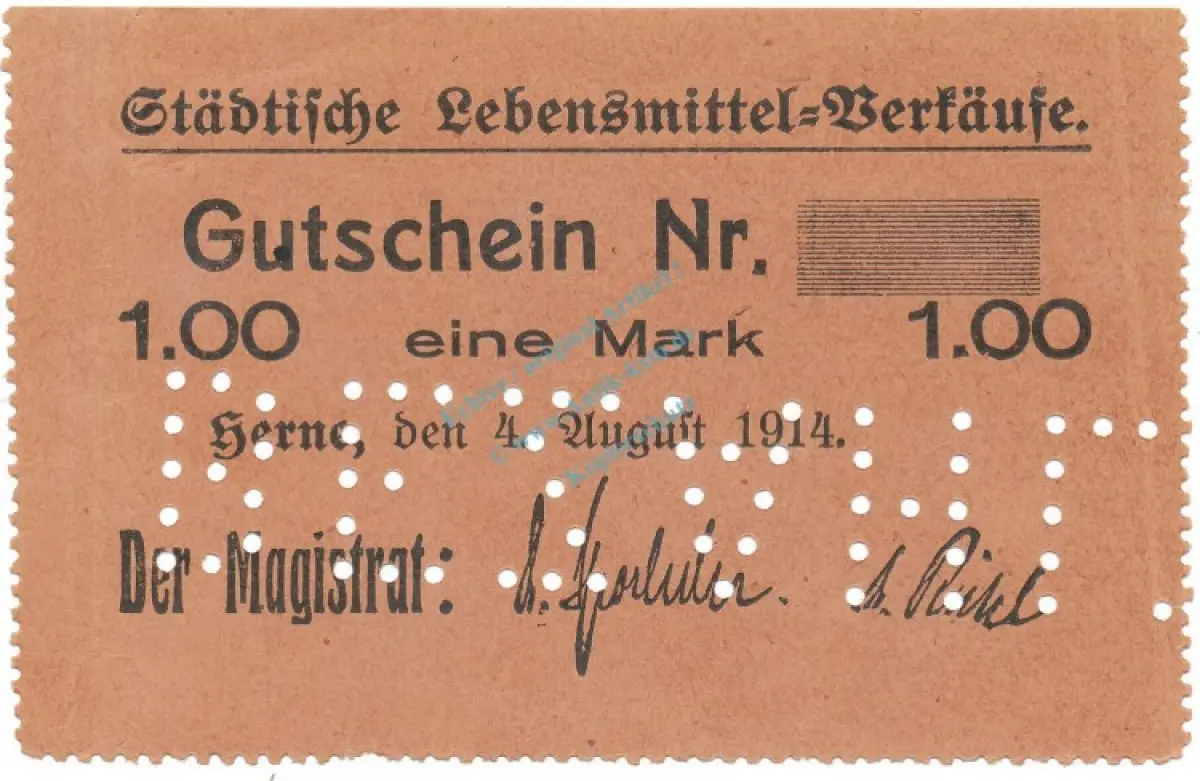 Herne , Notgeld 1 Mark Schein unc-kfr.E Diessner 148.4.d , Westfalen 1914 Notgeld 1914-15