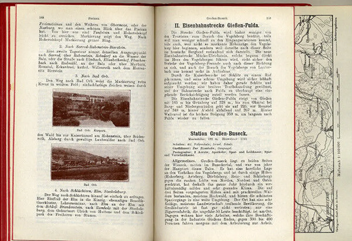 mit GESAMT 450 Seiten mit 100 Abbildungen 3 großen Karten 5 Übersichtskarten und 4 Plänen einem Ortsregister, einem Hotel und Gaststätten Verzeichnis, ausführliche Beschreibung von Städten Orten Dörfern der Rhön, dem Vogelsberg und der Wetterau mit einem geographischen geologischen und historischen Überblick des gesamten Gebietes mit Angaben zu Geschichte,Trachten, Volkskunde und wirtschaftliche Entwicklung.Burgen und Schlösser,Kultur und Sehenswürdigkeiten Wege und Tourenübersicht für Wanderungen und Ausflüge.