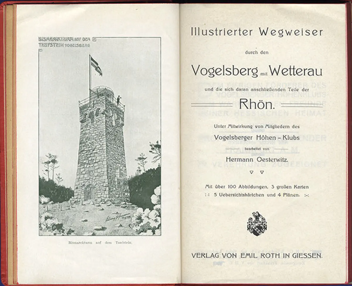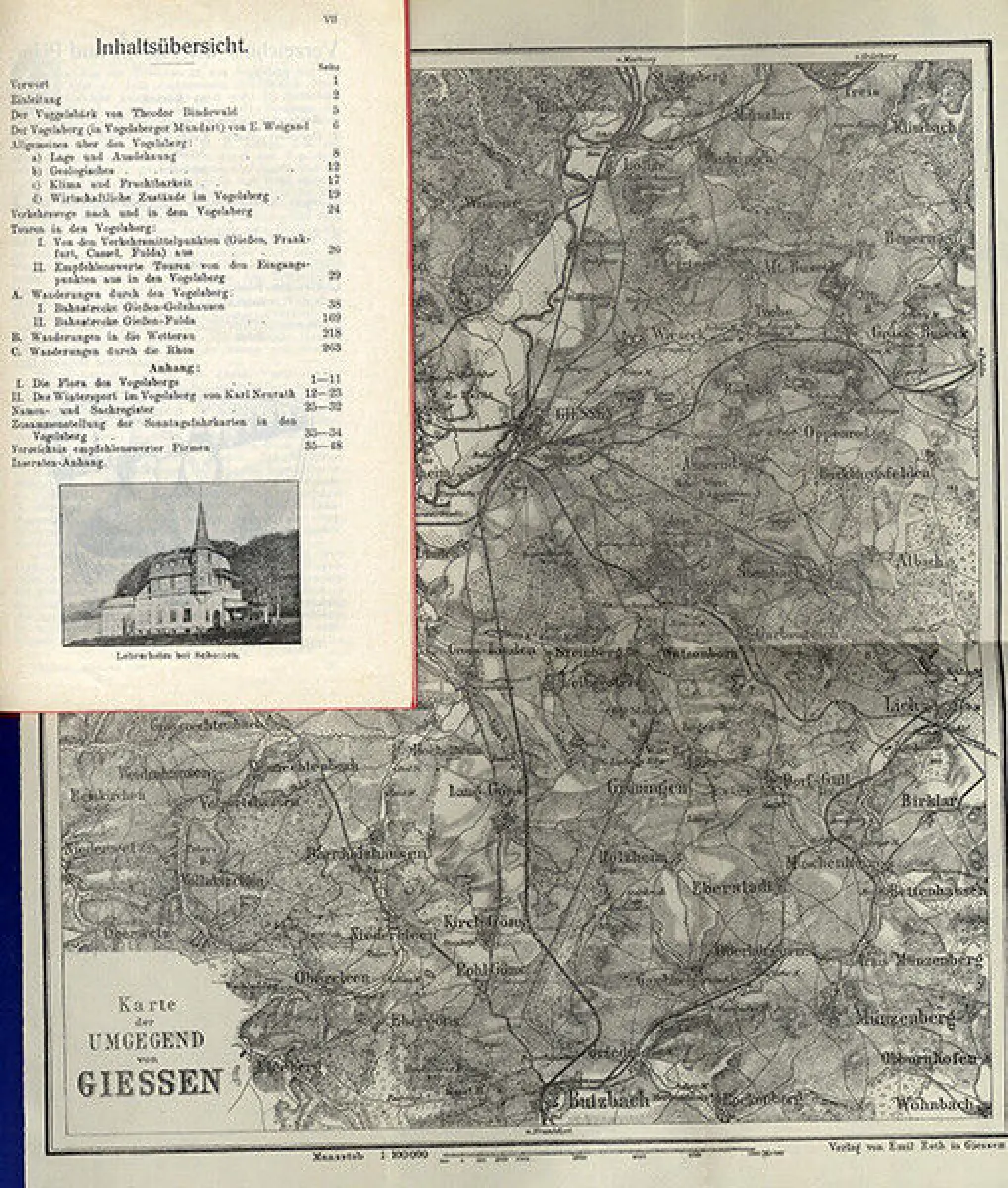 Roths Illustrierter Führer Nummer 3 Wegweiser durch den Vogelsberg mit Wetterau und die sich daran anschließenden Teile der Rhön. Unter Mitwirkung von Mitgliedern des Vogelsberger Höhen-Klubs bearbeitet mit 100 Abbildungen 3 großen Karten 5 Übersichtskarten und 4 Plänen regionalhistorische Buchausgabe mit viel Werbung und Reklame von 1902