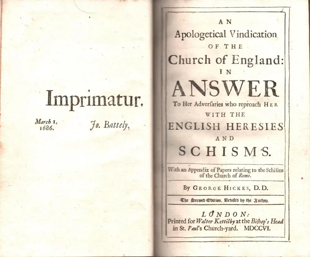 Hickes, George: An apologetical vindication of the Church of England. In answer to her adversaries who reproach her with the English heresies and schisms. With an appendix of papers relating to the schisms of the Church of Rome. The second edition, revise