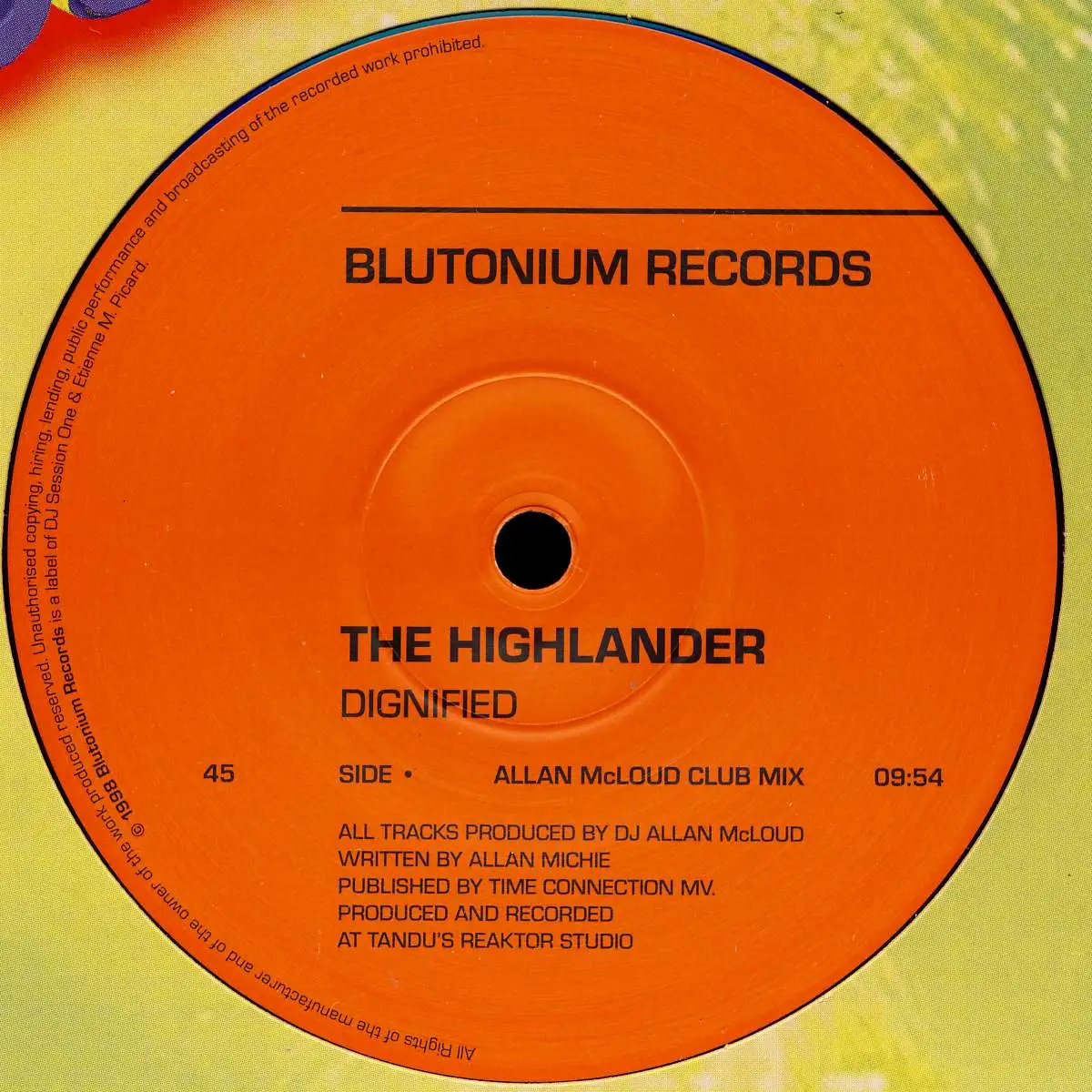 12" Maxi Highlander - Dignified, Einheitscover der Plattenfirma, Zustand Platte M- Hülle M-; Made in Germany 1998 Blutonium BLU 002, Tracks Allan McLoud Club Mix 9:54, Tough Mix 7:50