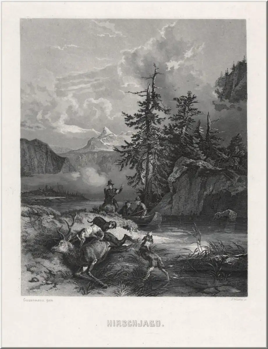 Hirschjagd, Gauermann. Originaler Stahlstich, Wurster um 1850