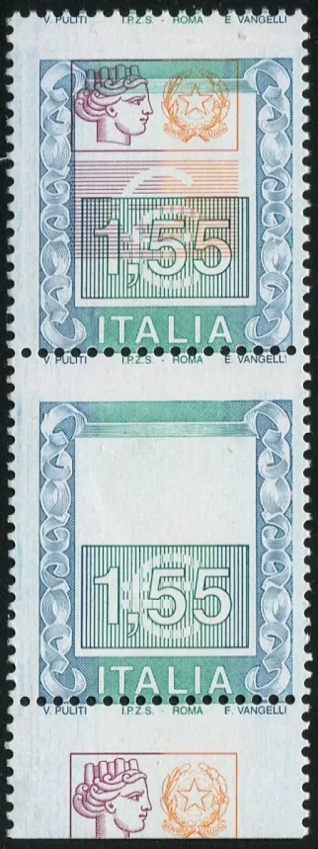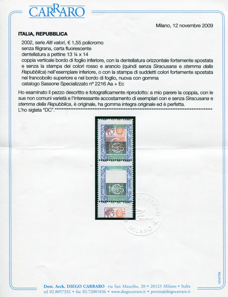 Hohe Werte Euro 1,55 Sorten Rot- und Gelbdruck verschoben Vollgummi - Hohe Werte Euro 1,55 Nr. 2581 vertikales Paar mit stark verschobenem Rot- und Gelbdruck. Das untere Exemplar ohne Kopf und Wappen der Republik (Sass. spec. n. 2216Aa) - Cert. Carraro Nr. 666/6