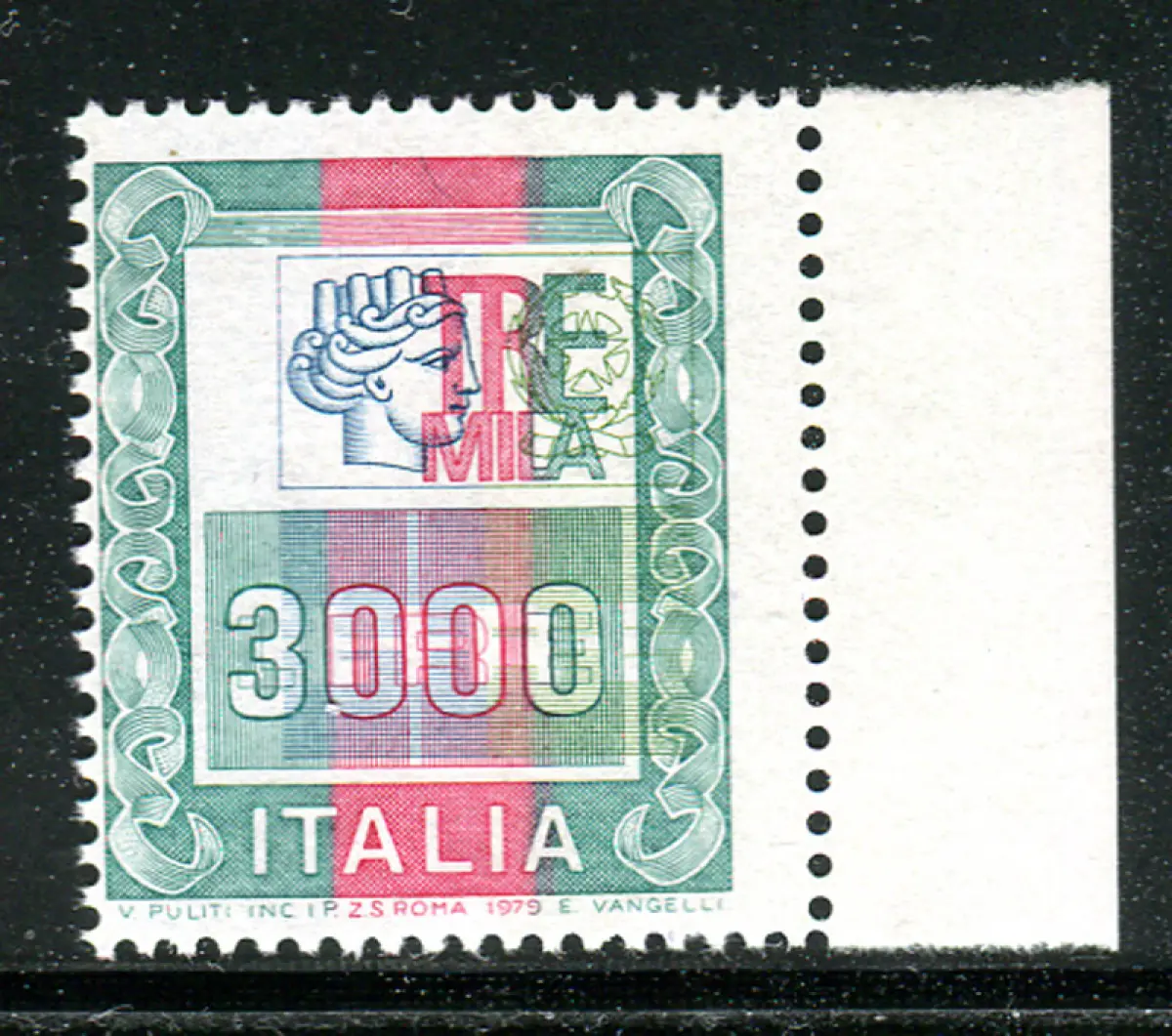 Hohe Werte Lire 3.000 Sorten Kopf nach rechts verschoben Vollgummi - Hohe Werte Lire 3.000 Nr. 1440 stark nach rechts verschobener Mitteldruck (Sass. spec. Nr. 1054 Aa) - Kat. euro 125 Cod. 800/13