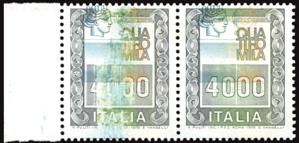 Hohe Lire-Werte 4.000 Paar Sorten Vollgummi MNH - Hohe Lire-Werte 4.000 Nr. 1441 horizontales Paar b. von f. mit Mitte Farben mit stark nach oben verschobenem Syrakuskopf pro mm. 5 - Das linke Exemplar mit Aufdruck, in der Mitte, verwirrend und gestreift - Unveröffentlicht Cod. 536/16