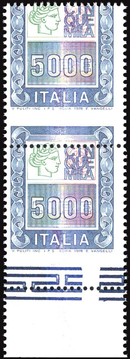 MNH - Vollgummi - - Hohe Werte Lire 5.000 Nr. 1442d vertikales Paar b. von f. unten mit stark nach unten verschobener horizontaler Verzahnung - ein Exemplar mit dem griechischen Rand in der Vignette - Selten für Ausgabespezialisten Cod.699/182