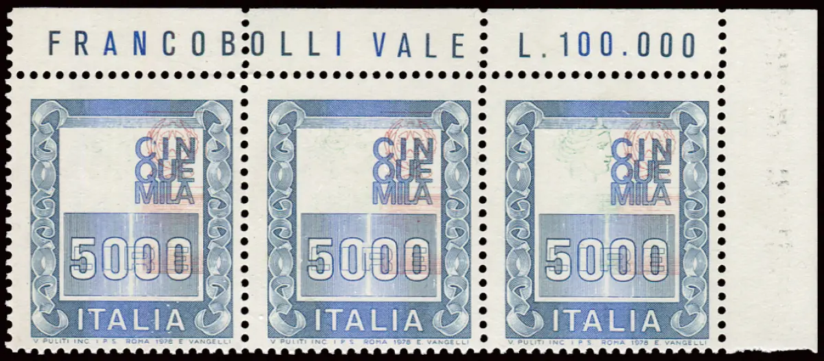 Hohe Werte Lire 5.000 Streifen Vergängliche Sorte Vollgummi MNH - Hohe Werte Lire 5.000 Nr. 1442 wunderschöner Streifen von drei Exemplaren a. von f. mit stark unvollständigem, vergänglichem Syrakus-Druck - Selten Cod. 581/15