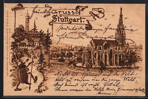 Holzbrand-Imitations-AK Stuttgart, Strassenpartie mit Kirche