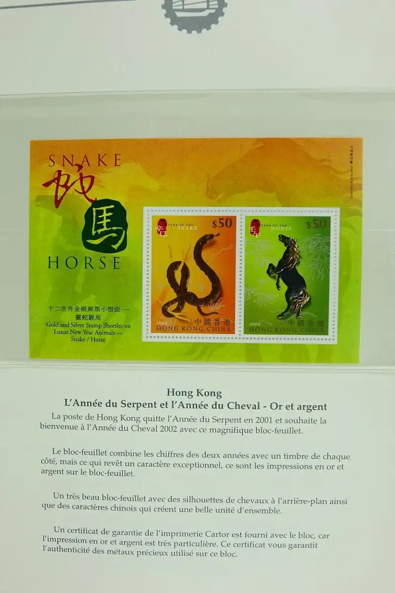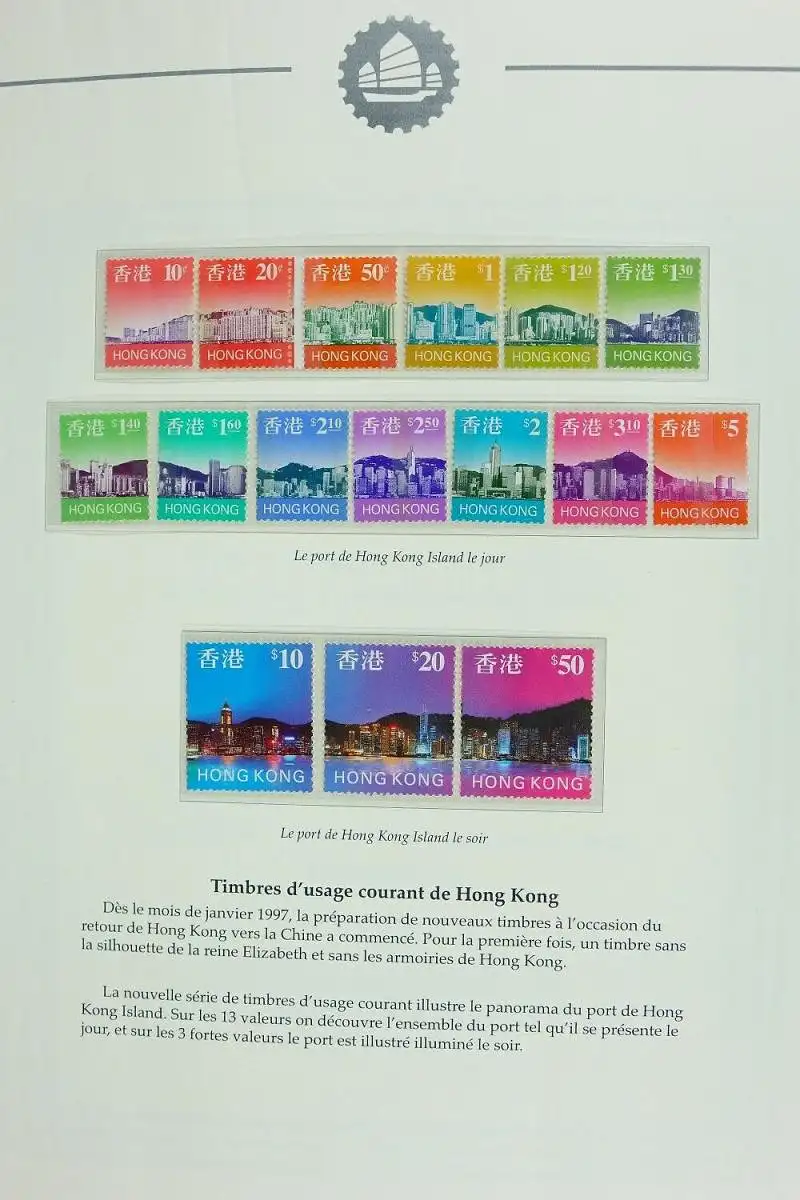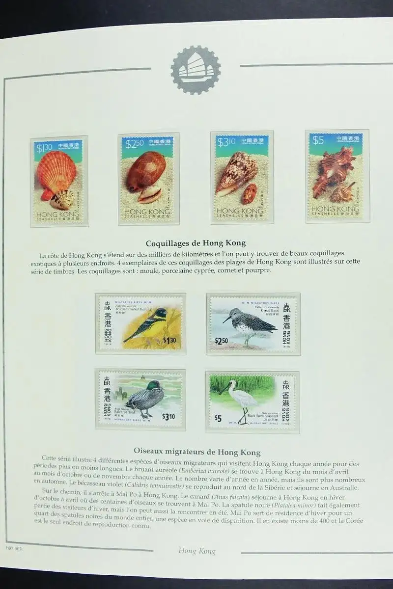 HONGKONGUmfangreiche Sammlung (ab 1997 bis Mitte 2014) auf französischen Vordruckblättern in 5 Bindernmit Schuber (Leuchtturm).Die Sammlung ist gemäß Vordrucken komplett, es fehlen nur wenige Ausgaben.Zusätzlich sind div. Besonderheiten wie z. B. einige Belege, H-Blätter, Markenhefte, Kleinbögen und Specimen-Folder enthalten. Der gute Block 125 ist selbstverständlich vorhanden.Die Photos zeigen nur einen kleinen Teil der Sammlung.