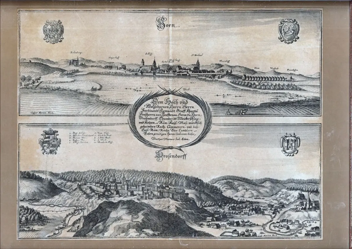 Bemerkungen: Nebehay-Wagner 407, Anh. II, 1 - Frühe Ansichten von Horn und Dosendorf auf einem Blatt. Aus dem ersten Anhang von Merian, M.: "Topographia Provinciarum Austriacaru(m), Austriae Styriae, Carinthiae, Carniolae, Tyrolis