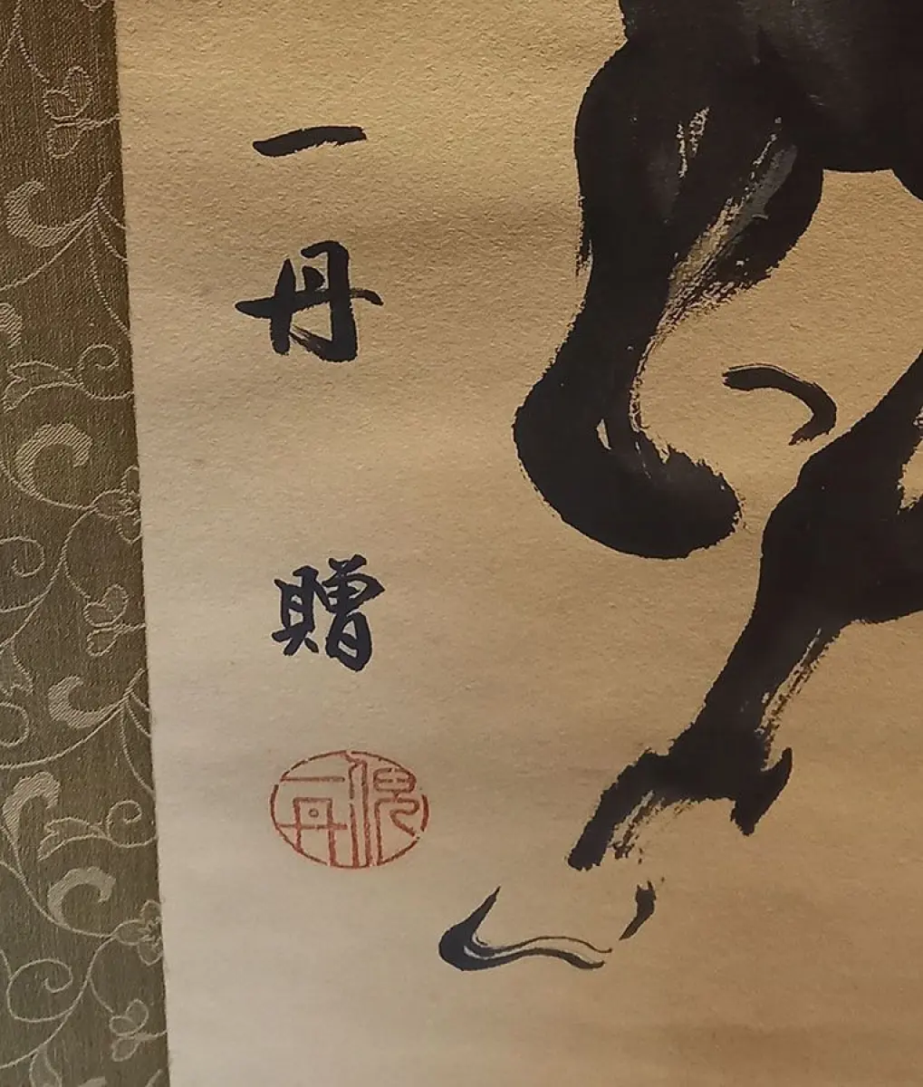 Bemerkungen: Chinese paper hanging scroll depicting 2 horses and calligraphy in the manner of Ye Zuibai. With unknown signature seal.