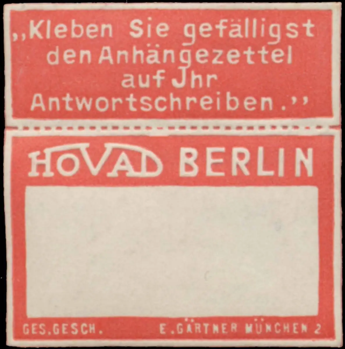 Etikett, Druckerei: E. Gärtner, München, Größe/Zustand: 3x3 , guter Zustand, Original alte Reklamemarke die seinerzeit für die Werbung benutzt wurde
