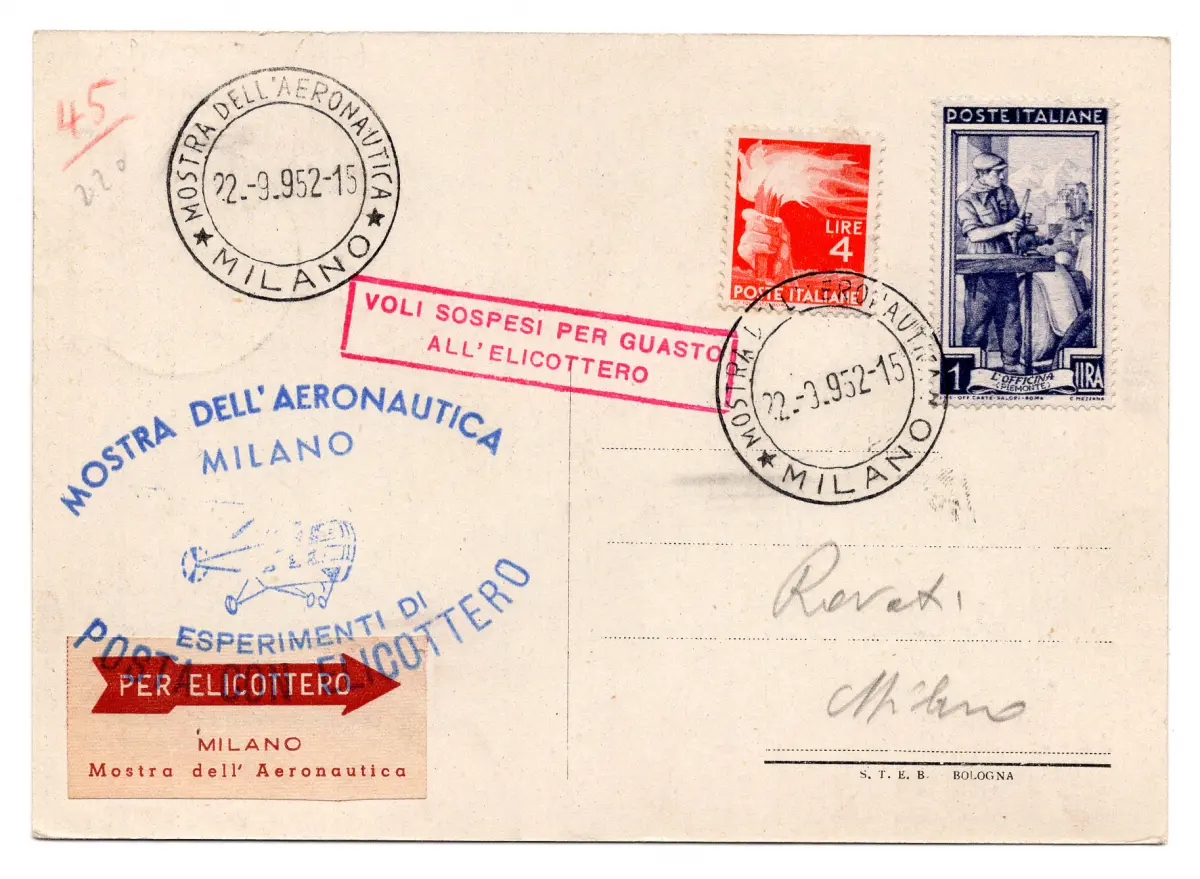 Postkarte - Hubschrauberflug wegen Panne nicht durchgeführt - Postkarte mit Annullierung Luftfahrtausstellung Mailand vom 22.9.52 (Kat. Pellegrini Nr. 494) Cod. 712/17