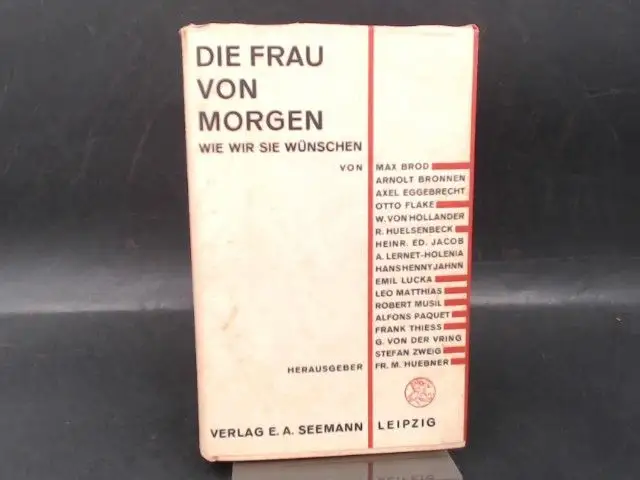 Die Frau von Morgen. Wie wir sie wünschen. Von Max Brod, Arnolt Bronnen, Axel Eggebrecht, Robert Musil, Stefan Zweig, Frank Thiess, Walther von Hollander u.a. Herausgeber: Friedrich M. Huebner. Dieses Buch stammt aus der Sammlung der Stiftung Heinrich Arbs mit Besitzstempel der Landeszentralbibliothek Flensburg. Es handelt sich aber nicht um ein Bibliotheksexemplar und das Buch war nicht in der Ausleihe. Einband teils minimal fleckig. Bindung zwischen vorderem Einbanddeckel und Buchblock ca. 2cm angebrochen. Vorder- und Fußschnitt/wenige Seiten leicht fleckig. Vorsatz minimal fleckig. Sonst guter Gesamtzustand