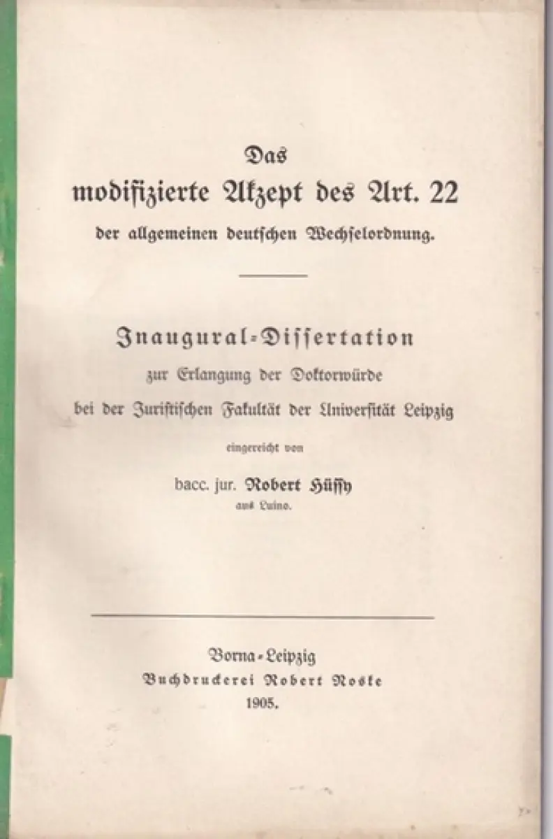 Hüssy, Robert: Das modifizierte Akzept des Art. 22 der allgemeinen deutschen Wechselordnung. Inaugural-Dissertation ... bei der Universität Leipzig.