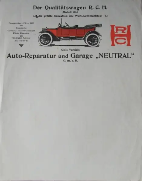 Hupp-Yates 1913 "R.C.H. Qualitätswagen" Firmenanschreiben Automobilprospekt (3566)