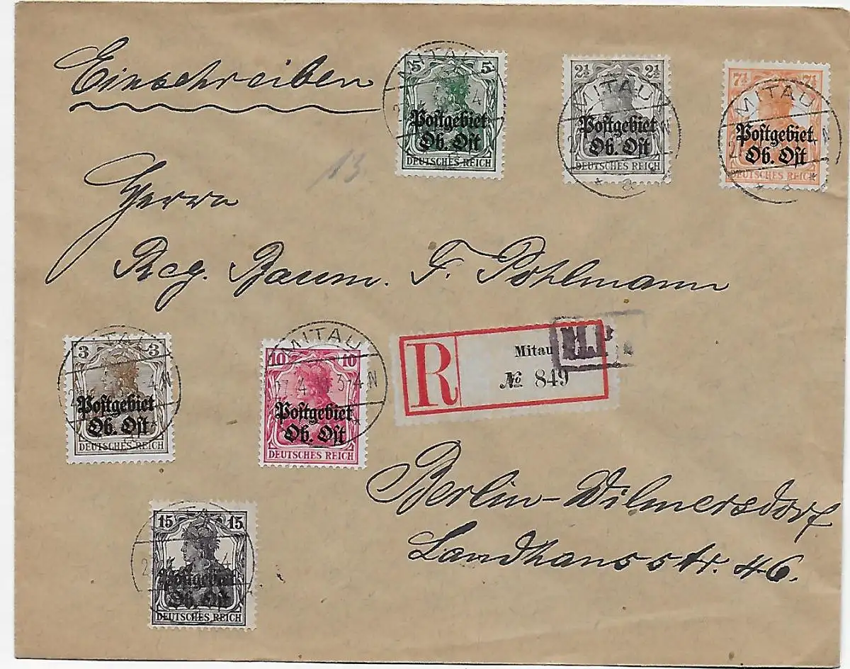I. WK Polen: Einschreiben Mitau nach Berlin Wilmersdorf 1918, OB. Ost