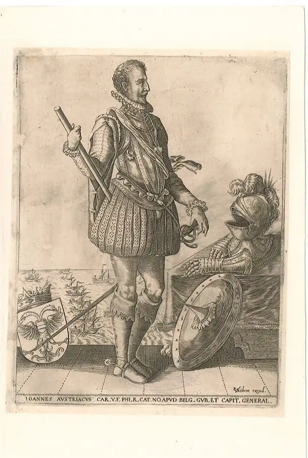 Bemerkungen: L.2587a - Ganzfigürliche Darstellung von Juan de Austria (1547-1578), dem unehelischen Sohn von Kaiser Karl V. und Barbara Blomberg. Der Kupferstich stammt von Christoffel van Sichem (1564-1624), ist in der Platte signiert "CVSichem excudit", sowie in der oberen rechten Ecke mit Nummer (339) versehen. Der Stich erschien 1611 in dem Werk "Niderländische Historien oder Geschichten aller deren Händel, so sich zugetragen von Anfangs deß Niederländischen Kriegs" von Emmanuel van Meteren. Verso mit Sammlerstempel von Wofgang von Wurzbach "Porträt-Sammlung Dr. W. v. Wurzbach - Dublette".