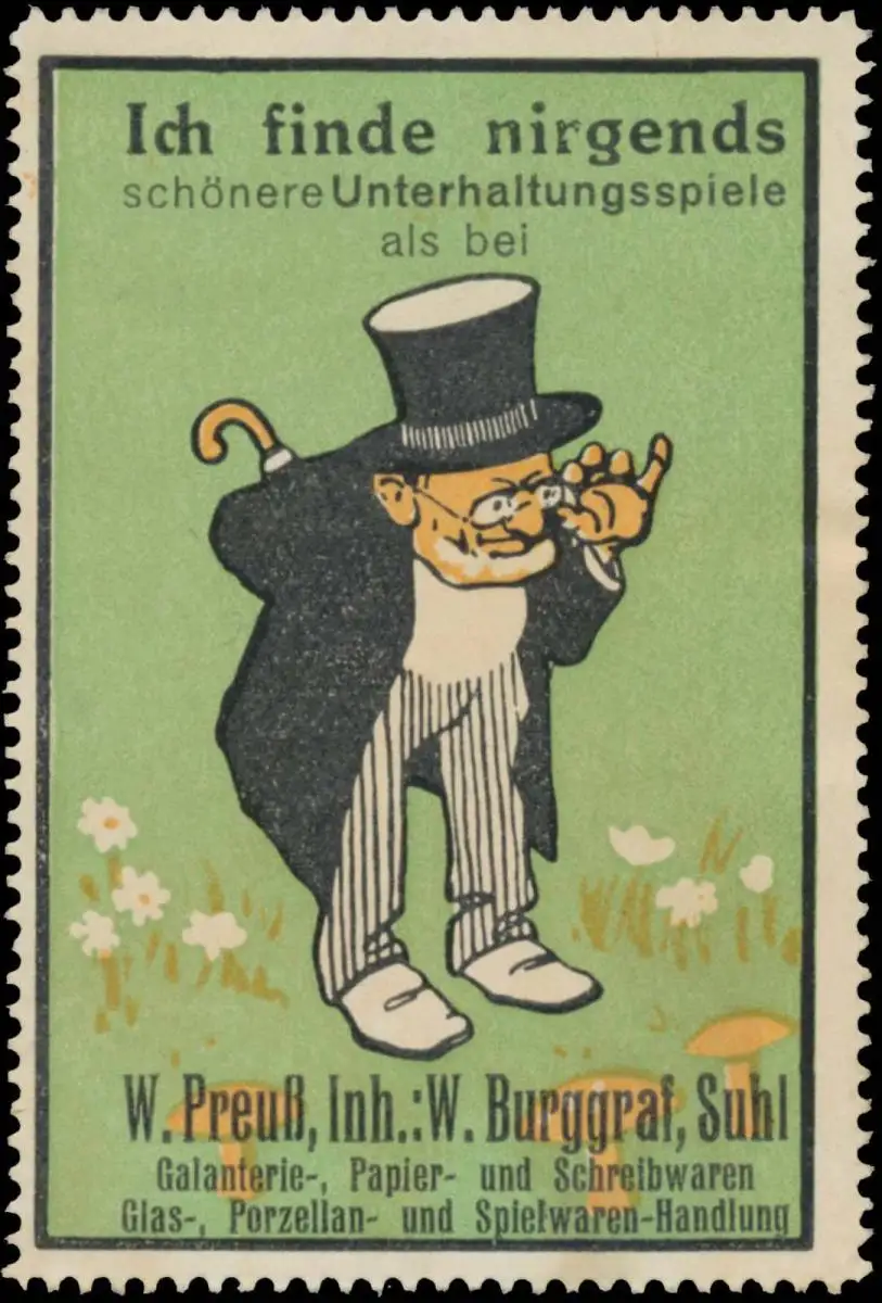 Galanterie-, Papier-, Glas-, Porzellan-, Spielwaren- und Schreibwarenhandlung, Inhaber: W. Burggraf, Spielzeug, Größe/Zustand: 7x5 , guter Zustand, Original alte Reklamemarke die seinerzeit für die Werbung benutzt wurde