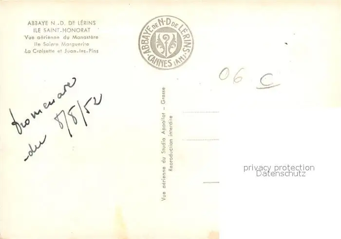Ile_Saint-Honorat_Alpes_Maritimes Abbaye Notre Dame de Lérins vue aérienne Ile_Saint-Honorat postalisch nicht gelaufen 1952 Erhaltung siehe scans [FriedD77] Frierer