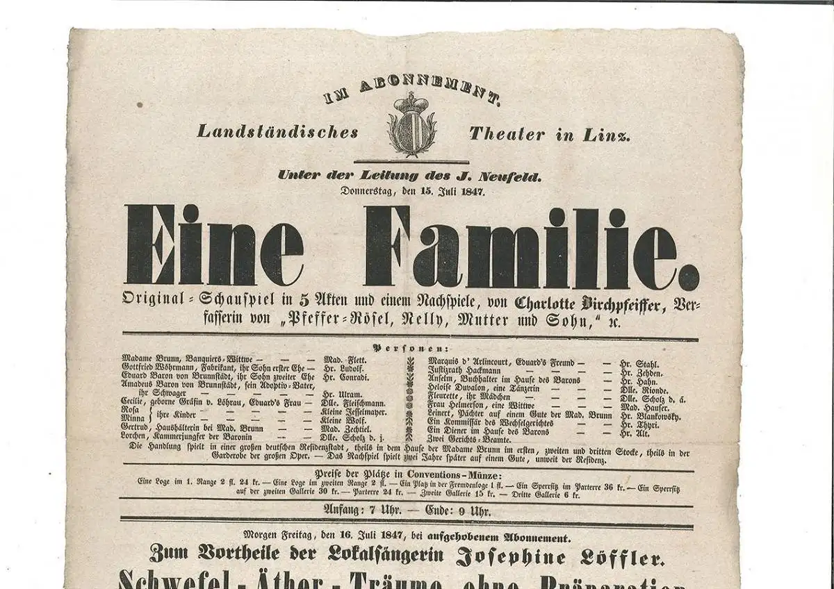 Bemerkungen: Theaterzettel des "Landständischen Theaters in Linz" anlässlich einer Vorstellung des Stücks "Die Familie" von Charlotte Birch-Pfeiffer (1800-1868). Weiter: "Morgen Freitag, en 16. Juli 1847, bei aufgehobenem Abonnement. Zum Vortheile der Lokalsängerin Josephine Löffler. Schwefel-Äther-Träume ohne Präparation, oder: Vielleicht gelingt die Operation?! [...] Zum Schluß: Zum ersten male: Der Fehlschuß [...]".