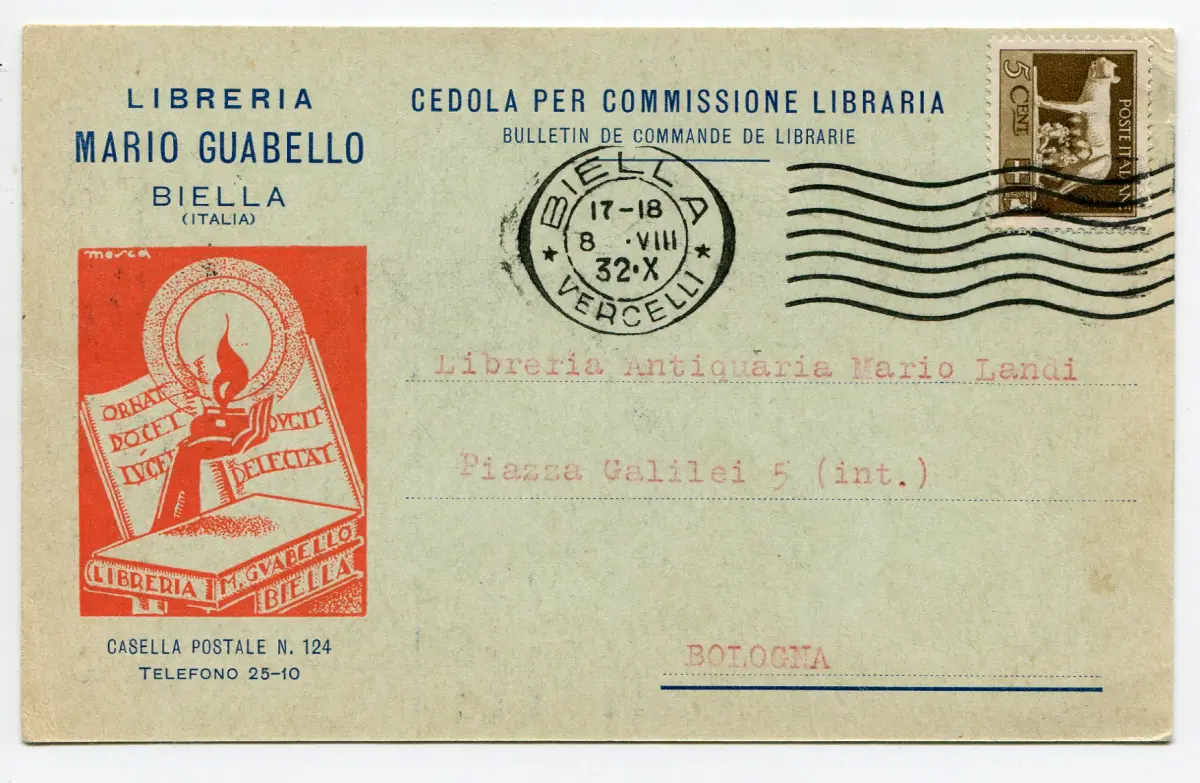 Imperiale Cent. 5 Blocks auf Buchkommissionsgutschein - Kaiserreich Cent. 5 Nr. 243 isoliert auf Buchkommissionsgutschein von Bilella nach Bologna am 8.8.32 - angenehmer Werbekopf des Verlags Code 74/11